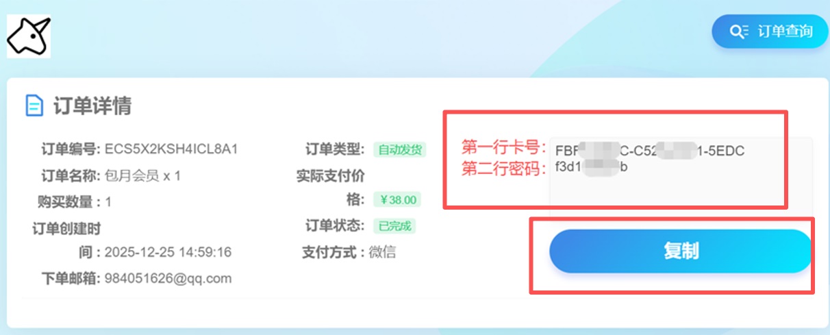 强调:购买卡密时,务必填上能记住的邮箱(建议QQ邮箱),一般购买付款后,页面会自动跳转到卡密页面,如果充值时忘记卡密,用邮箱或者购买订单号可以查到卡密(在卡密购买站页面顶部,点查询,输入订单号或者联系方式,即可查到购买的卡密)